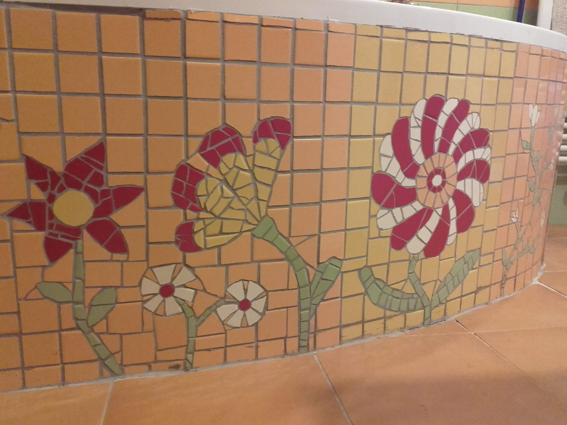 Můj milovaný manžel, přírodní stavitel, rekonstruoval mimo jiné domeček mým rodičům. Také jsem přiložila ruku k dílu a vytvořila květinovou mozaiku na vanu v koupelně...
