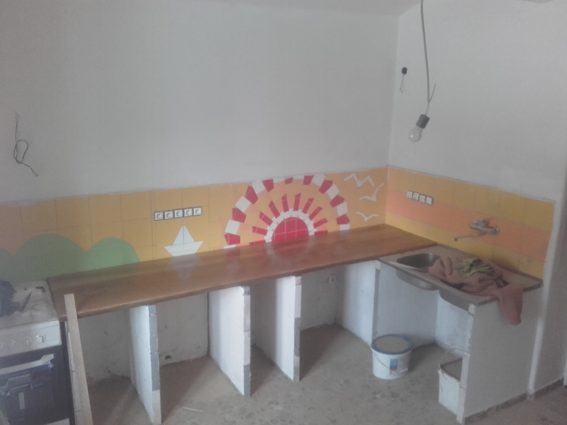 ... a také v kuchyni, nad speciální zděnou linkou s dřevěnou masivní pracovní deskou.
