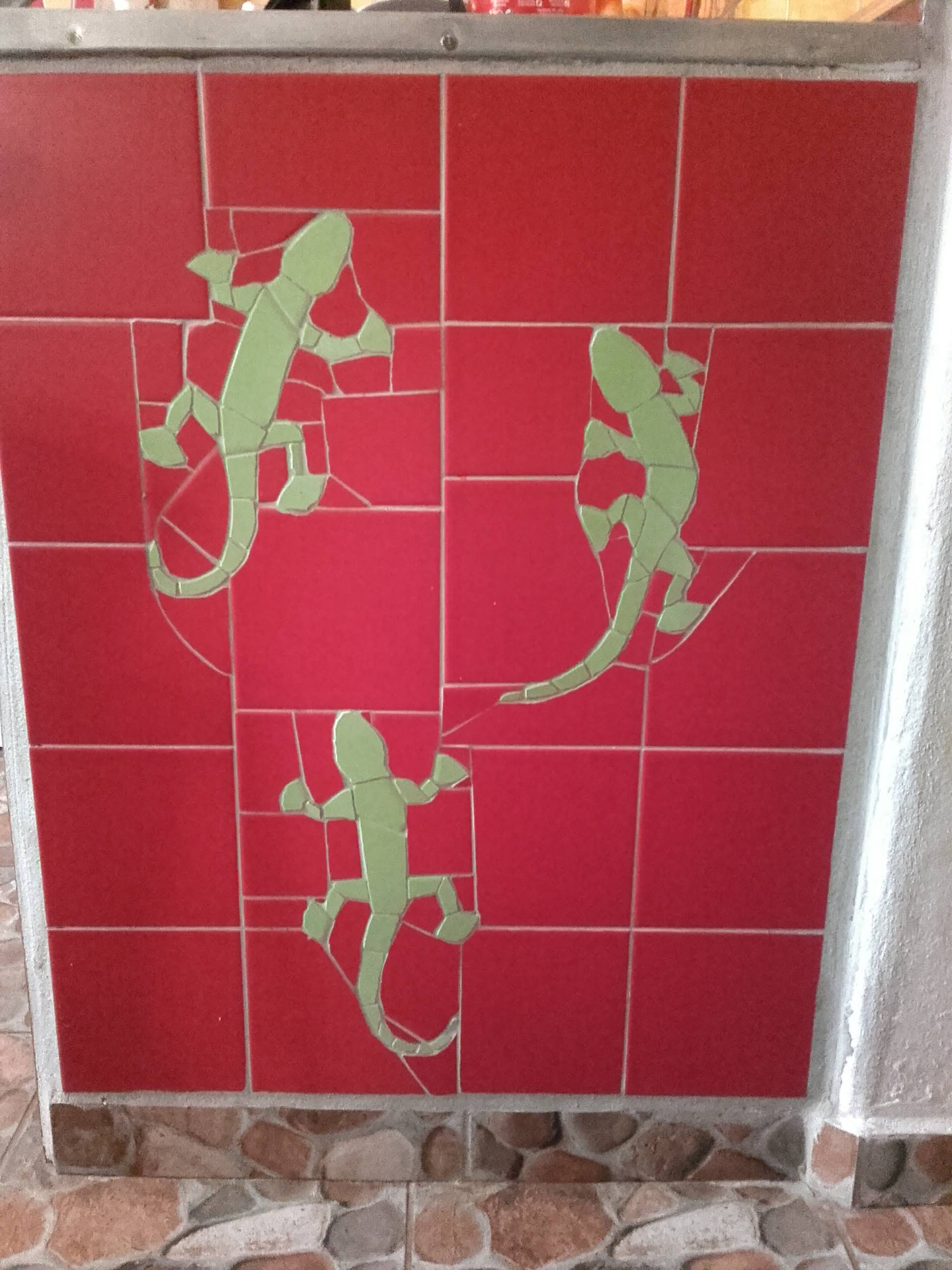 Na faře v Jívové, kde jsme téměř pět let s manželem a dětmi bydleli v pronájmu, jsem na venkovní zdi vytvořila toto hliněné sgrafiti (formou vrstvení hliněných barevných omítek a vyškrabávání jednotlivých vrstev).
